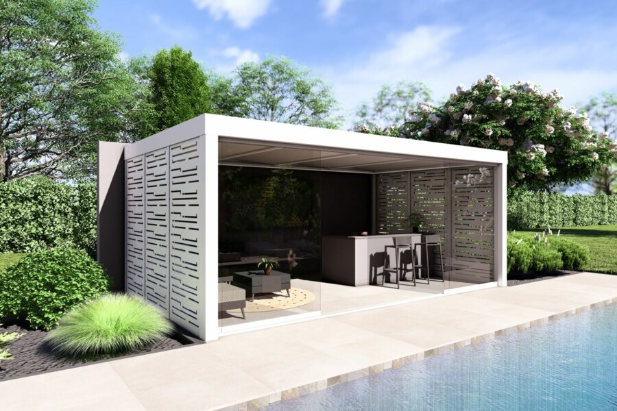 Pergola bioclimatique à lames orientables et rétractables d’un côté