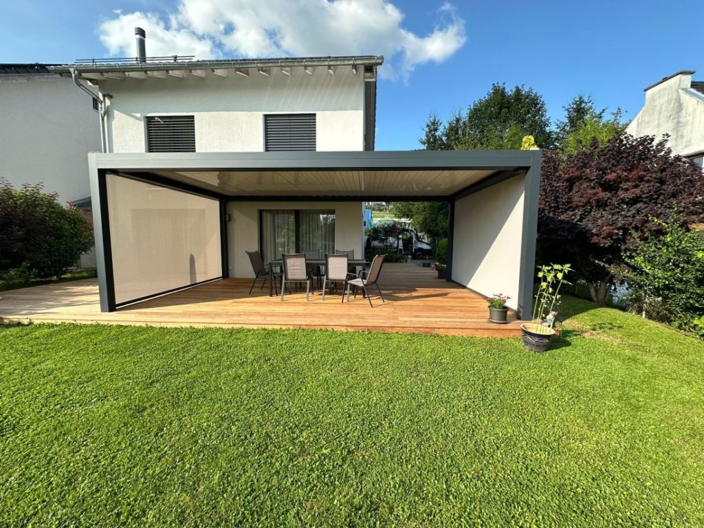 Pergola à toiture mixte : panneaux sandwich et lames orientables.